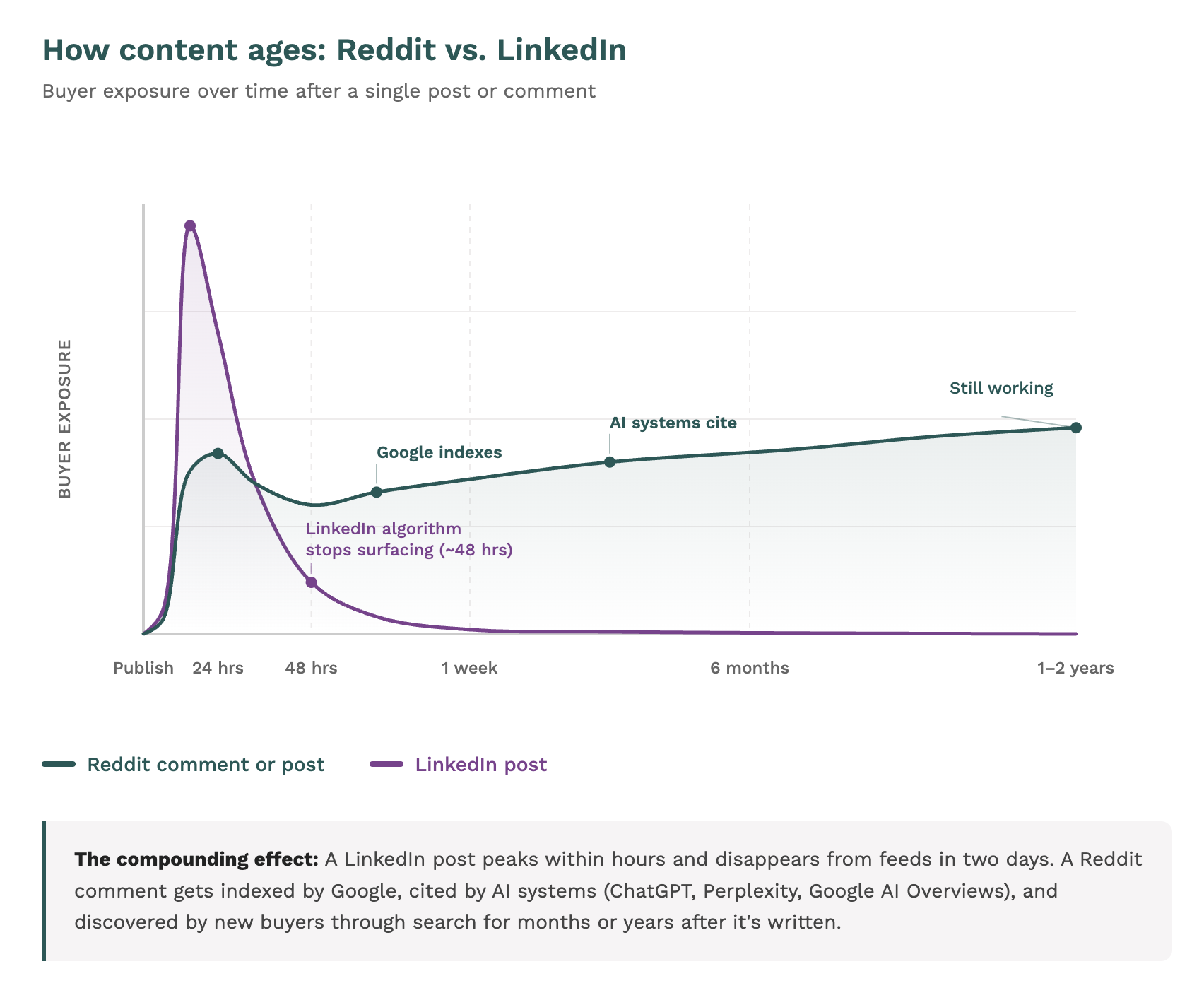 The AI citation advantage, the search visibility, the buyer trust. It's all still available in most B2B categories. The cost gap between Reddit and LinkedIn won't hold forever, and the time to start building is before your competitors figure out the same thing.