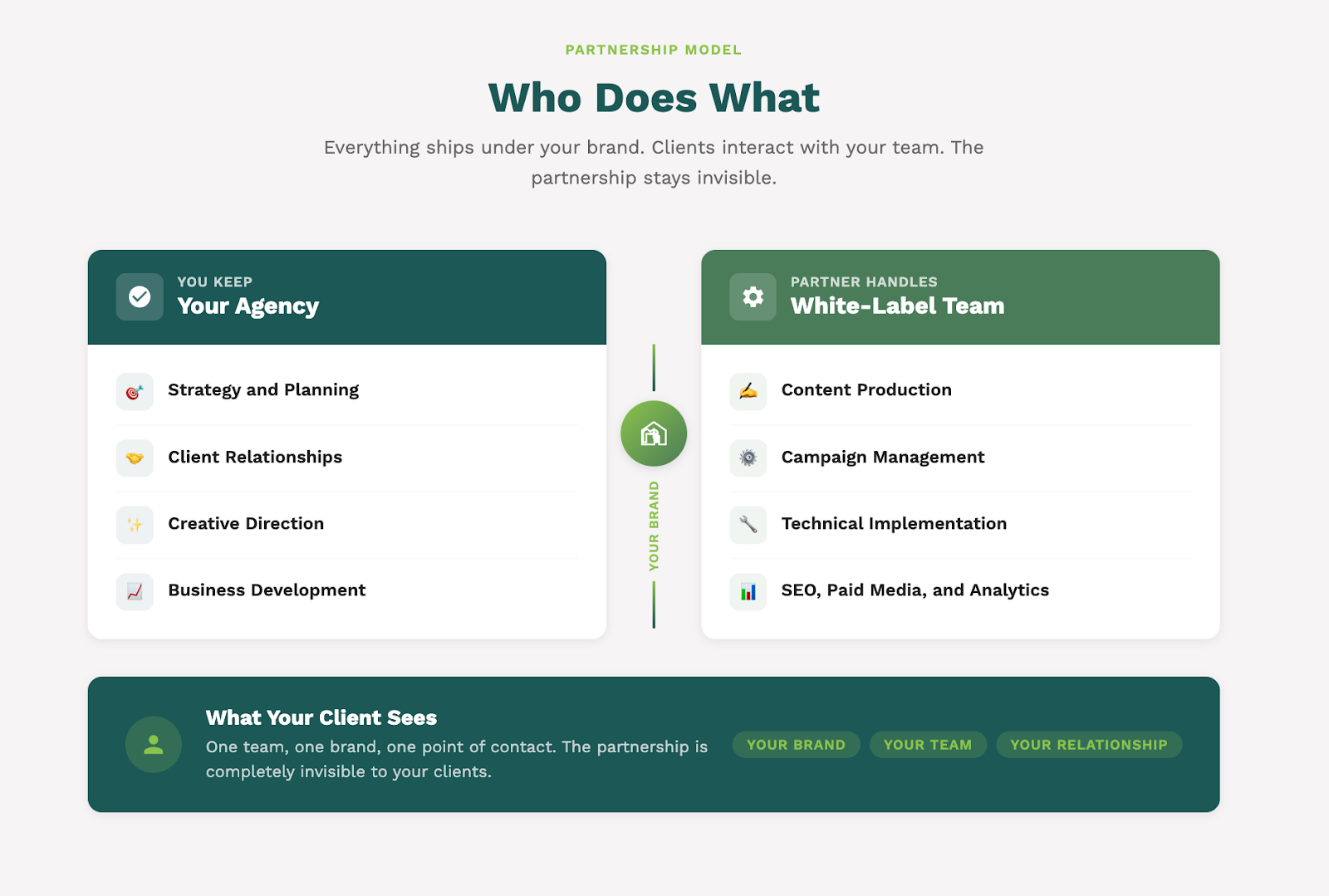 Your partner handles: Content production, campaign management, technical implementation, SEO and paid media, analytics infrastructure.